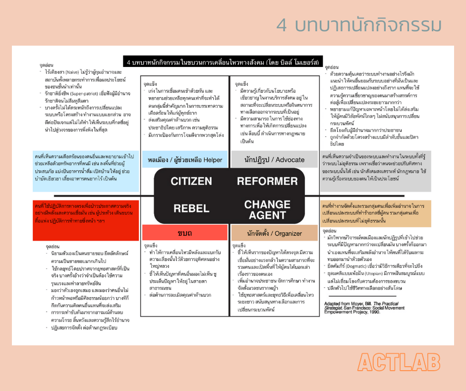 ทั้ง 4 บทบาทต่างมีพลังขับเคลื่อนขบวนการเคลื่อนไหวในแต่ละจังหวะก้าว จาก 8 ขั้นตอนของขบวนการเคลื่อนไหวทางสังคม (MAP) จะพบบทบาทที่โดดเด่นในแต่ละขั้น