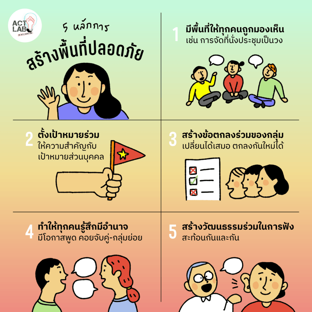 พื้นที่ปลอดภัยคือพื้นที่ที่ทุกคนแสดงความเป็นตัวเองได้โดยไม่ถูกพิพากษาตัดสิน เป็นพื้นที่ที่คนได้เรียนรู้ เติบโต และพัฒนาตนเอง