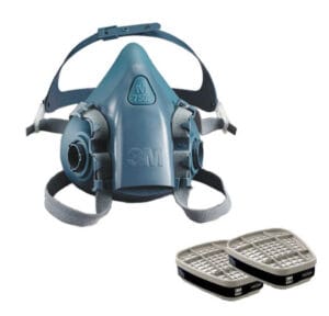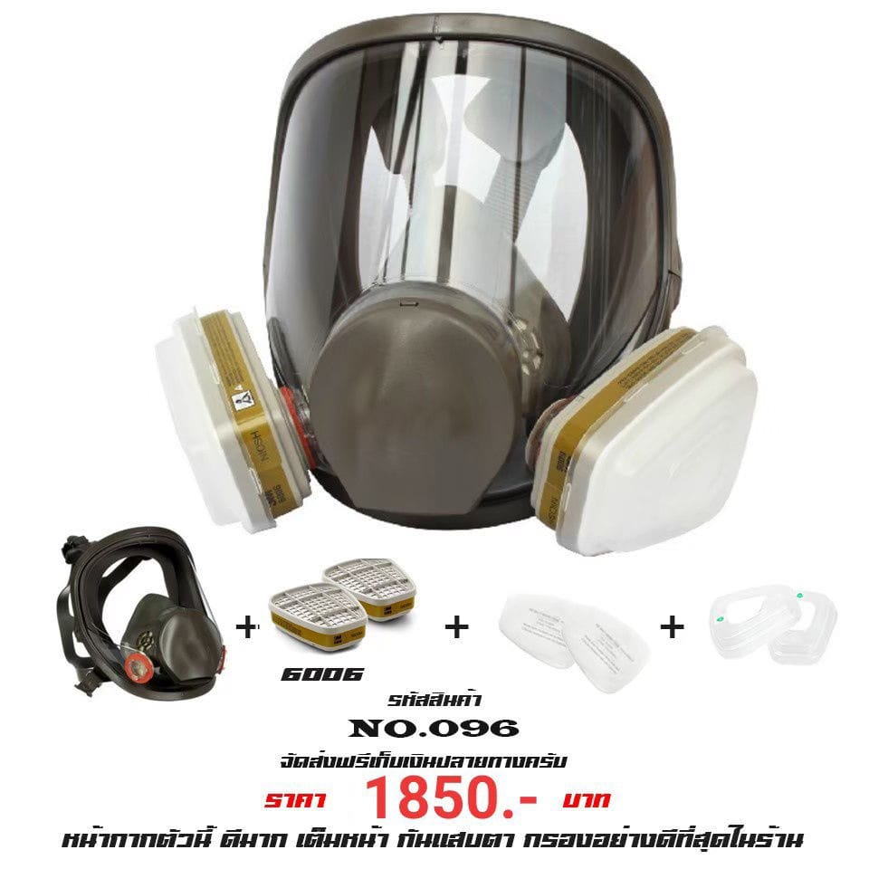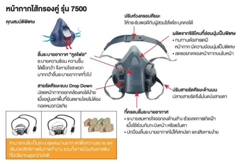 - หน้ากาก (ของยี่ห้อ 3M จะเป็นซีรี่ส์ 6 และ 7 โดยขนาดเล็กหรือขนาดสำหรับผู้หญิงจะเป็นรุ่น 6100, ขนาดกลางหรือขนาดสำหรับผู้ชายจะเป็นรุ่น 6200, ซีรี่ส์ 7 หรือรุ่นที่ขึ้นหน้าด้วยเลข 7 จะเป็นรุ่นที่ราคาแพงกว่าเพราะซิลิโคนจะนุ่มกว่า)