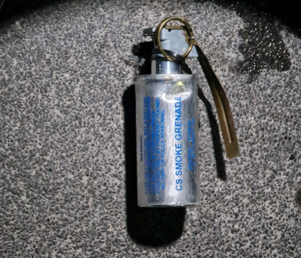 ตัวอย่างกระป๋องแก๊สน้ำตาแบบขว้างที่ตกอยู่ในพื้นที่ที่มีการสลายการชุมนุม