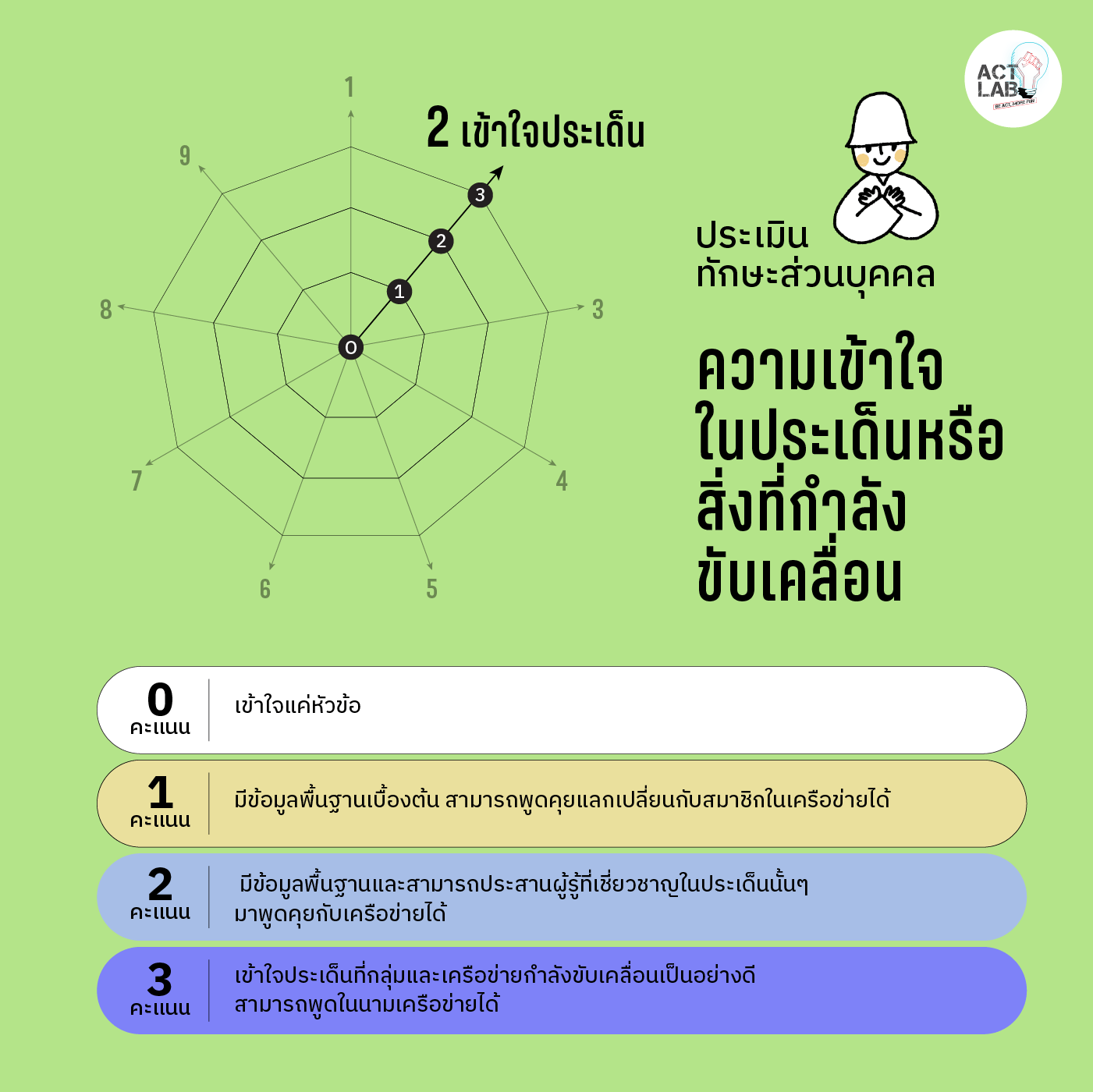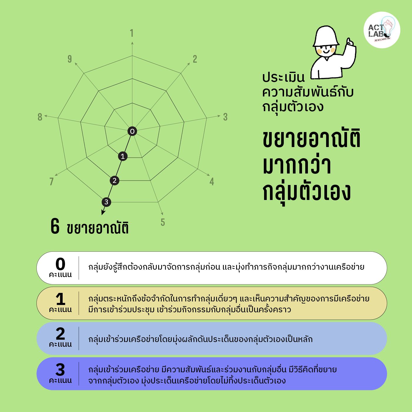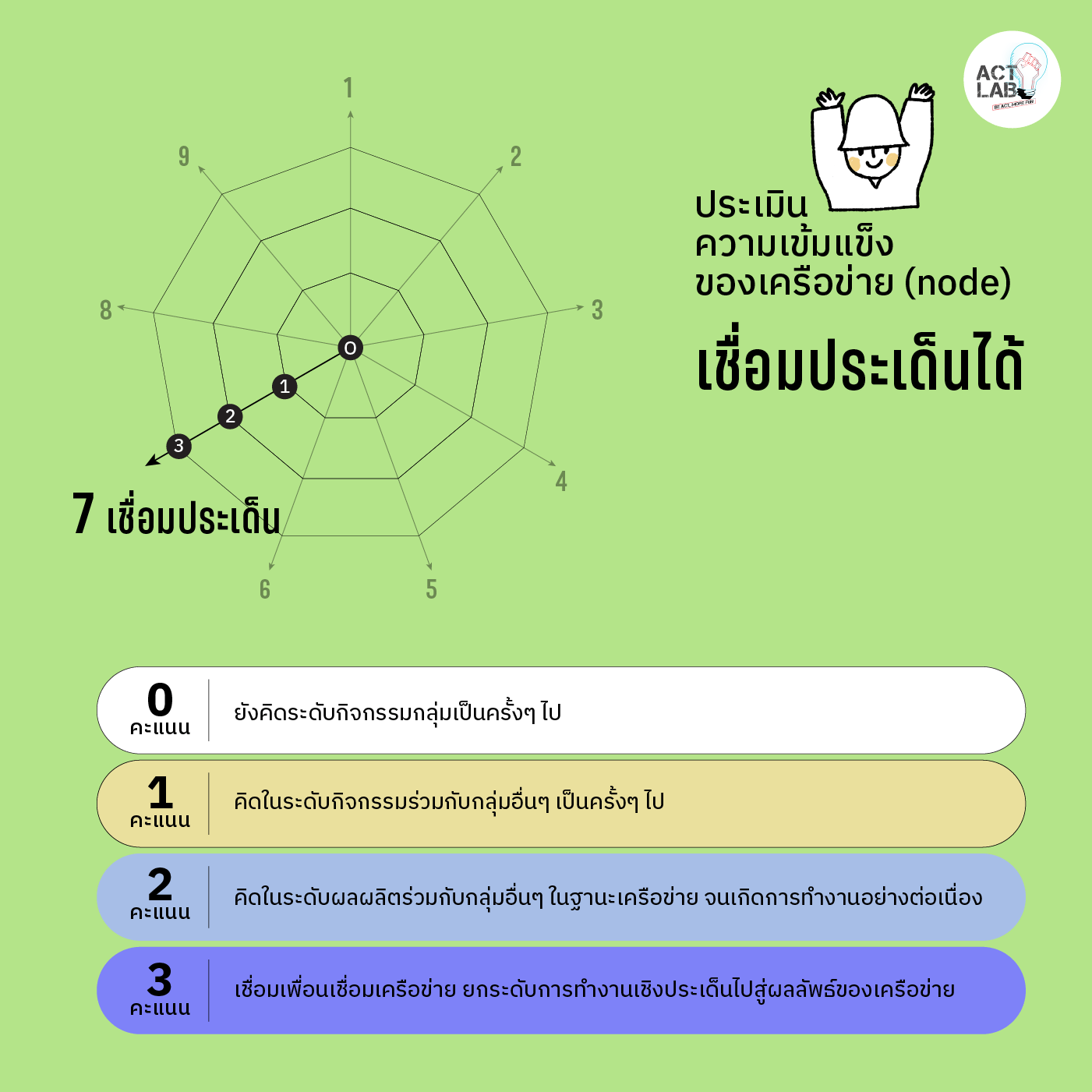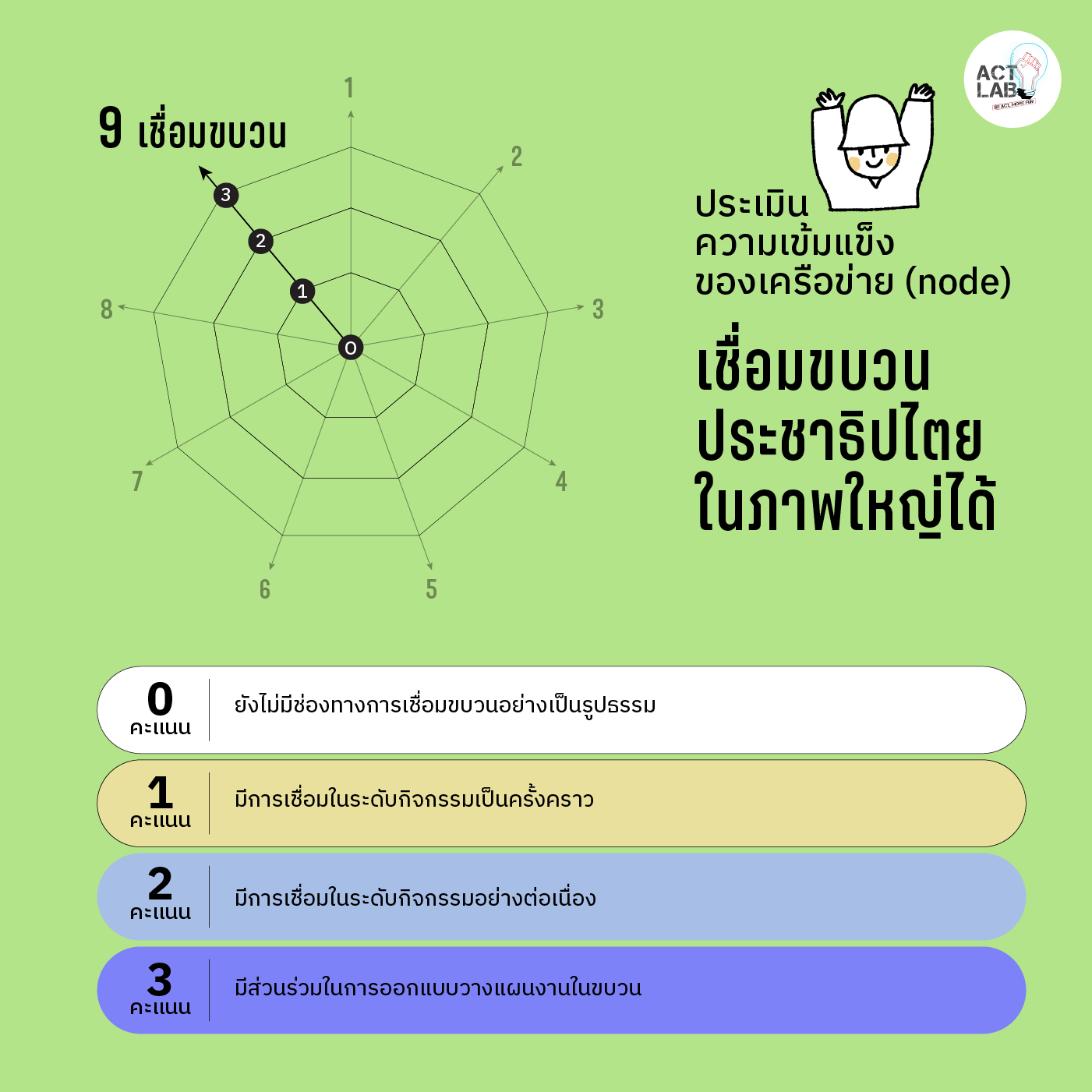 อนึ่ง ช่างเชื่อมในความหมายนี้ไม่ใช่ปัจเจกบุคคลโดดๆ แต่คือคนที่มีกลุ่มฐานรองรับ ไม่หลุดลอยจากกลุ่มตัวเอง ดังนั้นตัวชี้วัดหนึ่งที่มีอยู่ในทุกข้อคือความสัมพันธ์ของช่างเชื่อมกับกลุ่มของตนซึ่ง Act Lab ให้น้ำหนักเรื่องนี้เป็นพิเศษ