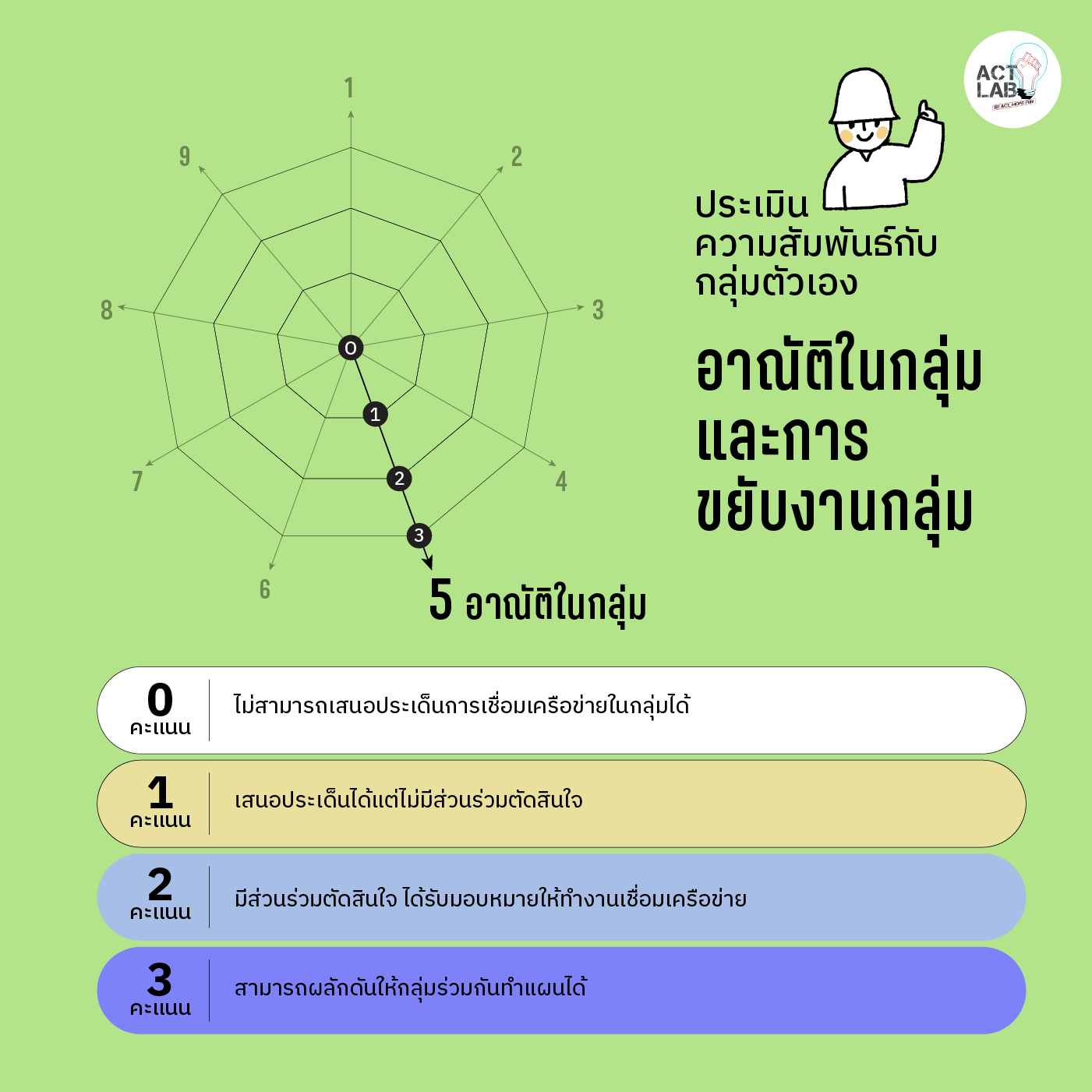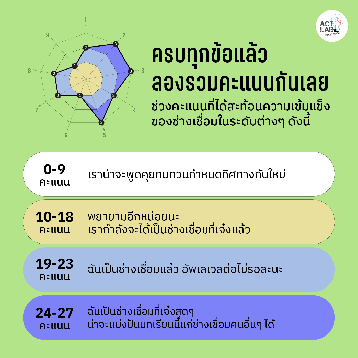 เมื่อทำแบบทดสอบครบทุกข้อแล้วลองรวมคะแนนกันเลย ช่วงคะแนนที่ได้สะท้อนความเข้มแข็งของกลุ่มในระดับต่างๆ ดังนี้